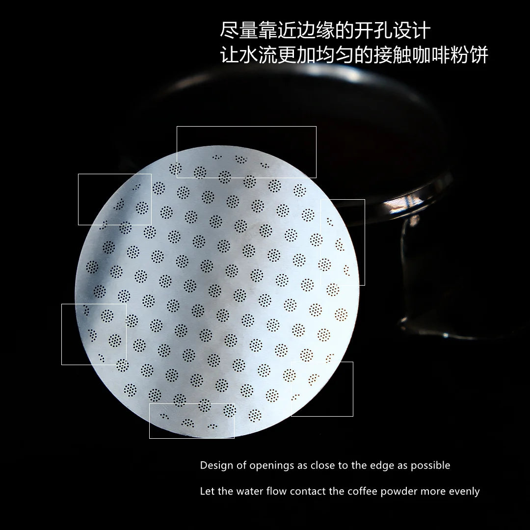 - فلتر إسبريسو مزدوج الطبقات: فلتر ٥٨.٥ مم مصنوع من شبكة ٢٤١٣، ودقة ترشيح ٠.٢٥ مم. توزيع موحد لفتحات الفلتر، مما يُحسّن كفاءة تدفق القهوة.