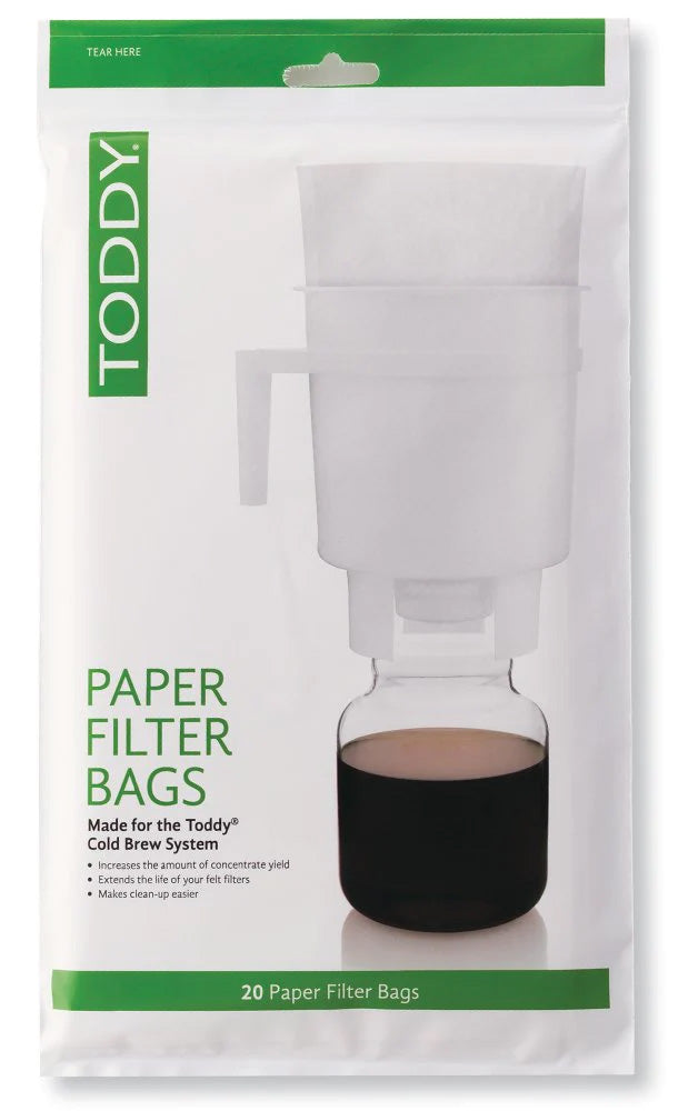 عبوة من 20 كيس فلتر ورقي في عبوة إعادة البيع. مثالية للتخمير البارد حتى 1 رطل من القهوة.