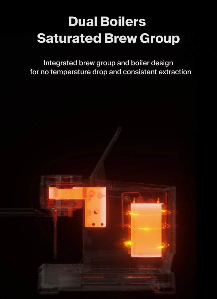 - Dual stainless steel boilers for brew and steam stability (0.8 steam+0.35L coffee boiler)